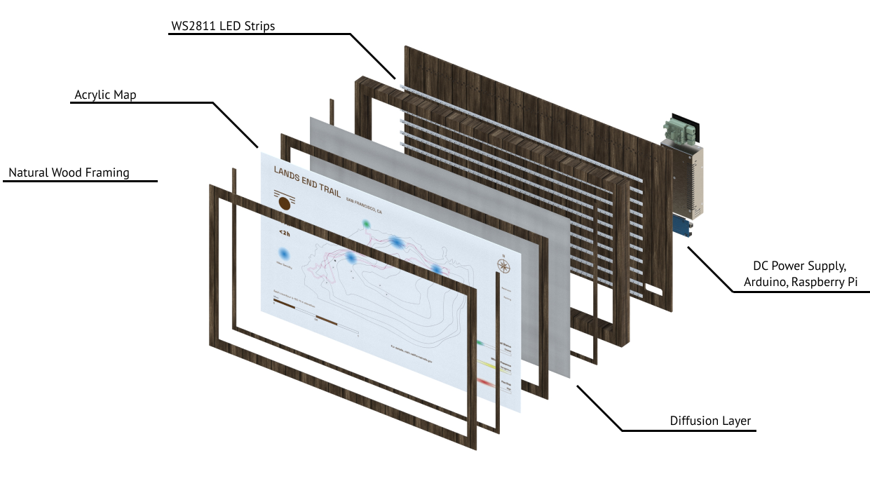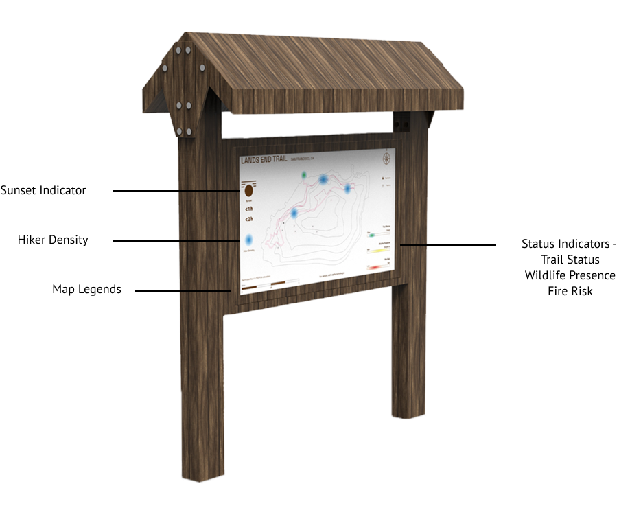 This public device is viewed by hikers at the onset of a hike, providing vital live information such as trail status, hiker density, and weather. This visualized data is provided by the trackers on the trail and continually updated by the park ranger.