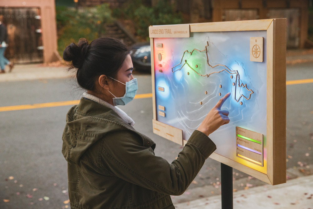 An alternative to analog trailhead maps, able to communicate live trail conditions through live visualizations such as trail conditions or weather forecast